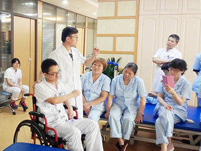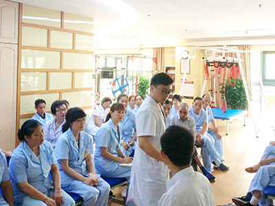 培训以脑卒中后偏瘫的患者为例,冉军主任演示了从卧位到坐位、从坐位到立位、从床到椅、从轮椅到卫生间等各种转移方法,一方面让教会患者自我转移能力,另一方面加强护工在照顾生活不能自理患者时的安全性,提高在院病人的康复信心。